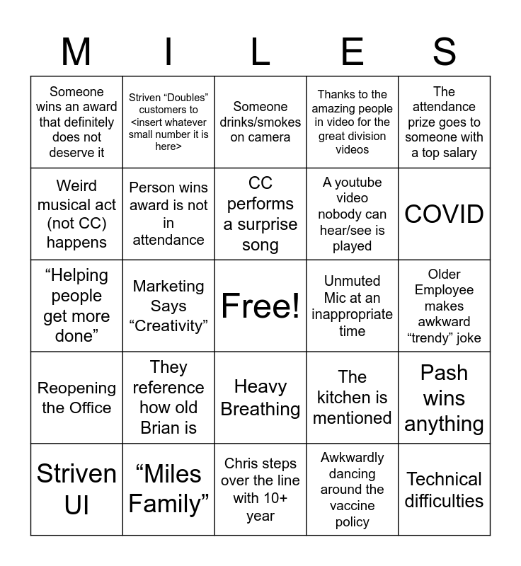 This bingo card has a free space and 37 words: Striven makes a wildly bold claim that is obviously false, The summit takes more than 90 minutes, Someone is muted for the start of their speech, Person wins award is not in attendance, Pash wins anything, They reference how old Brian is, CC performs a surprise song, Best Team award goes to the very not best team, The attendance prize goes to someone with a top salary, Brian DOES NOT win the sales award, Marketing Says “Creativity”, Thanks to the amazing people in video for the great division videos, Technical difficulties, Older Employee makes awkward “trendy” joke, Weird musical act (not CC) happens, Reopening the Office, Underclothed Employee/Family Member, Someone drinks/smokes on camera, Heavy Breathing, Unmuted Mic at an inappropriate time, Someone wins an award that definitely does not deserve it, COVID, Striven UI, Chris steps over the line with 10+ year, Chris makes a joke that everyone finds awkward, Awkwardly dancing around the vaccine policy, Striven “Doubles” customers to <insert whatever small number it is here>, “Best Year Ever/Yet”, Joke is made about not being able to hand the award to the recipient, JP says Git R Done, “India”, “Miles Family”, “Helping people get more done”, Someone makes their kids say something, The kitchen is mentioned, A youtube video nobody can hear/see is played and Someone tries to do the calculus on how long Mike Young has been here.