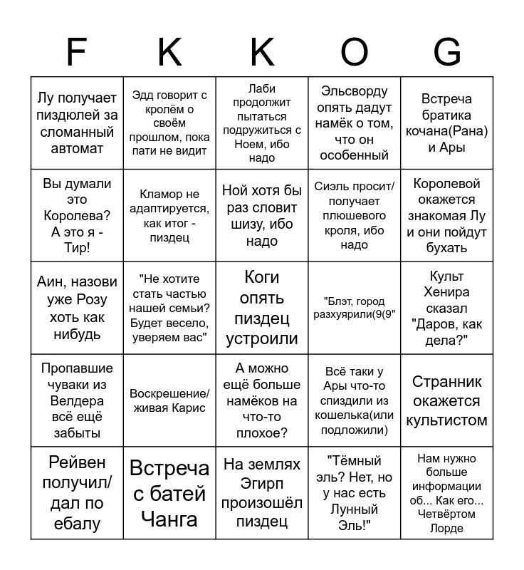 This bingo card has a free space and 24 words: Воскрешение/живая Карис, Встреча с батей Чанга, Ной хотя бы раз словит шизу, ибо надо, Рейвен получил/дал по ебалу, Встреча братика кочана(Рана) и Ары, Лу получает пиздюлей за сломанный автомат, Вы думали это Королева? А это я - Тир!, Эдд говорит с кролём о своём прошлом, пока пати не видит, "Блэт, город разхуярили(9(9", А можно ещё больше намёков на что-то плохое?, Сиэль просит/получает плюшевого кроля, ибо надо, Аин, назови уже Розу хоть как нибудь, Всё таки у Ары что-то спиздили из кошелька(или подложили), Странник окажется культистом, Кламор не адаптируется, как итог - пиздец, "Тёмный эль? Нет, но у нас есть Лунный Эль!", Культ Хенира сказал "Даров, как дела?", Лаби продолжит пытаться подружиться с Ноем, ибо надо, Королевой окажется знакомая Лу и они пойдут бухать, "Не хотите стать частью нашей семьи? Будет весело, уверяем вас", Нам нужно больше информации об... Как его... Четвёртом Лорде, Пропавшие чуваки из Велдера всё ещё забыты, Эльсворду опять дадут намёк о том, что он особенный and На землях Эгирп произошёл пиздец.