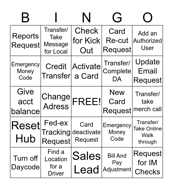 This bingo card has a free space and 24 words: Fed-ex Tracking Request, Find a Location for a Driver, Activate a Card, Turn off Daycode, Add an Authorized User, Reports Request, Emergency Money Code, Transfer/ Take Message for Local, New Card Request, Card deactivate Request, Transfer/ Complete DA, Give acct balance, Emergency Money Code, Transfer/ Take Online Walk through, Credit Transfer, Bill And Pay Adjustment, Transfer/ take merch call, Check for Kick Out, Update Email Request, Change Adress, Request for IM Checks, Reset Hub, Card Re-cut Request and Sales Lead.
