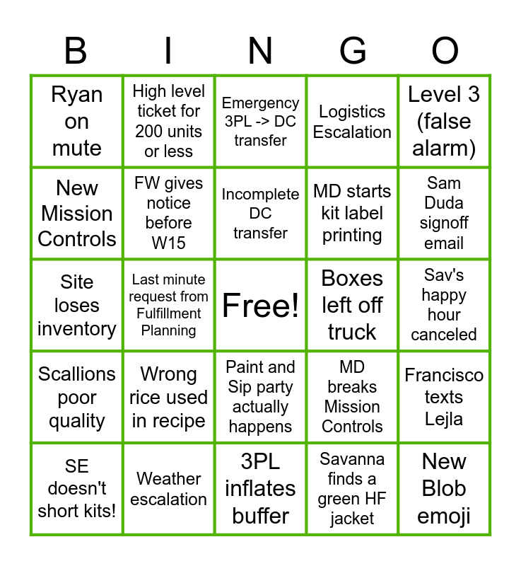 This bingo card has a free space and 36 words: Level 1 Ticket, Pet appearance, Shirese forgets 3PL Ops, FW gives notice before W15, MD breaks Mission Controls, Scallions poor quality, Incomplete DC transfer, Level 2 Ticket, Level 3 (false alarm), HD fire drill after Nate leaves, Last minute request from Fulfillment Planning, Logistics Escalation, Boxes loaded on wrong truck, Boxes left off truck, Sam Duda signoff email, Ryan on mute, Lejla drinking wine before 5, Wrong rice used in recipe, New Blob emoji, Emergency 3PL -> DC transfer, Sav's happy hour canceled, Francisco texts Lejla, Weather escalation, SE doesn't short kits!, 3PL inflates buffer, High level ticket for 200 units or less, Site loses inventory, Misreceived, MD starts kit label printing, New Mission Controls, New 3PL!, New analyst, Savanna finds a green HF jacket, Paint and Sip party actually happens, 1.25% quality errors for the week and All sites use rollover tracker.