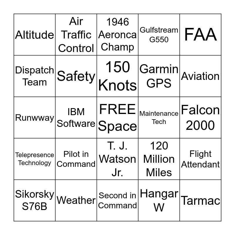 This bingo card has a free space and 24 words: Pilot in Command, Weather, 150 Knots, Sikorsky S76B, FAA, Altitude, Dispatch Team, Air Traffic Control, Maintenance Tech, T. J. Watson Jr., Garmin GPS, Runwway, 120 Million Miles, Flight Attendant, Safety, Hangar W, Falcon 2000, 1946 Aeronca Champ, Aviation, IBM Software, Tarmac, Telepresence Technology, Gulfstream G550 and Second in Command.