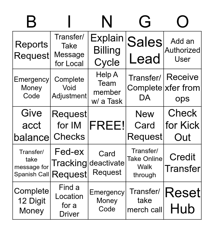 This bingo card has a free space and 24 words: Fed-ex Tracking Request, Find a Location for a Driver, Help A Team member w/ a Task, Complete 12 Digit Money, Add an Authorized User, Reports Request, Emergency Money Code, Transfer/ Take Message for Local, New Card Request, Card deactivate Request, Transfer/ Complete DA, Give acct balance, Transfer/ Take Online Walk through, Credit Transfer, Complete Void Adjustment, Transfer/ take merch call, Check for Kick Out, Explain Billing Cycle, Receive xfer from ops, Request for IM Checks, Reset Hub, Transfer/ take message for Spanish Call, Sales Lead and Emergency Money Code.