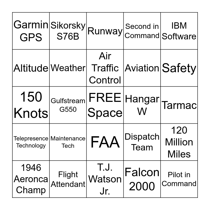 This bingo card has a free space and 24 words: Maintenance Tech, Flight Attendant, Air Traffic Control, 1946 Aeronca Champ, IBM Software, Garmin GPS, Altitude, Sikorsky S76B, Hangar W, FAA, Aviation, 150 Knots, Dispatch Team, 120 Million Miles, Weather, Falcon 2000, Tarmac, Runway, Safety, Gulfstream G550, Pilot in Command, Telepresence Technology, Second in Command and T.J. Watson Jr..