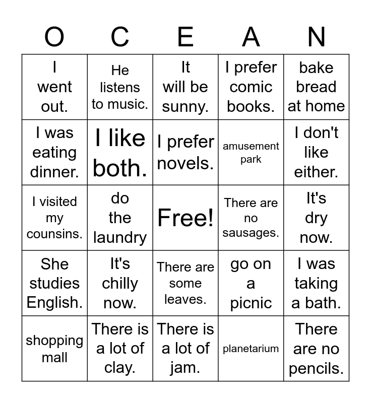 This bingo card has a free space and 24 words: It's chilly now., There is a lot of clay., I prefer novels., shopping mall, bake bread at home, I went out., I was eating dinner., He listens to music., There are no sausages., There are some leaves., amusement park, I visited my counsins., go on a picnic, I was taking a bath., I like both., planetarium, It's dry now., It will be sunny., I don't like either., do the laundry, There are no pencils., She studies English., I prefer comic books. and There is a lot of jam..
