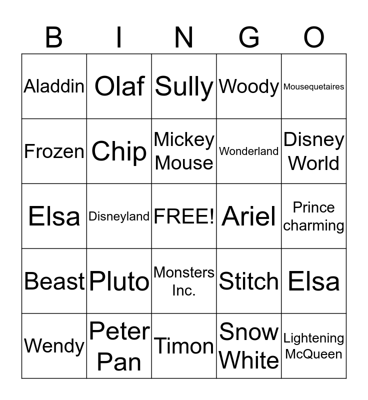 This bingo card has a free space and 42 words: Cinderella, Mickey Mouse, Minnie Mouse, Pluto, Snow White, Elsa, Lightening McQueen, Mike, Sully, Monsters Inc., Prince charming, Disney World, Disneyland, Mousequetaires, Lilo, Stitch, Nemo, Elsa, Anna, Olaf, Frozen, Dory, Tangled, Aladdin, Genie, Flounder, Wonderland, Simba, Lion King, Bambie, Big her 6, Beast, Chip, Timon, Pumba, Wendy, Peter Pan, Ariel, Jasmine, Buzz, Woody and Mr. Potato Head.