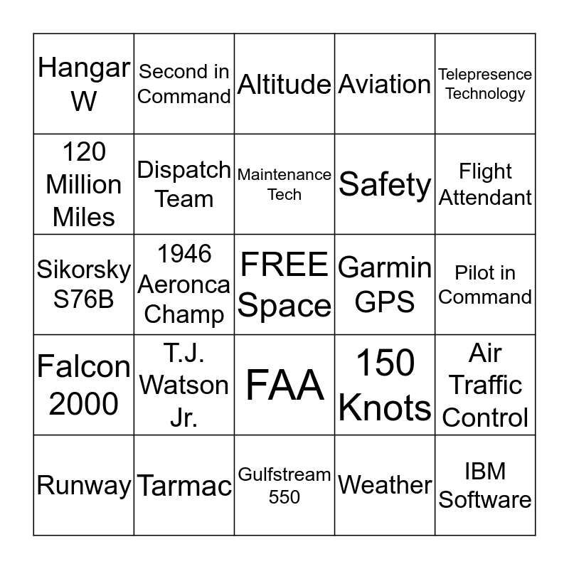 This bingo card has a free space and 24 words: T.J. Watson Jr., Tarmac, Maintenance Tech, Runway, Telepresence Technology, Hangar W, 120 Million Miles, Second in Command, Garmin GPS, FAA, Safety, Sikorsky S76B, 150 Knots, Air Traffic Control, Dispatch Team, Weather, Pilot in Command, Altitude, Flight Attendant, 1946 Aeronca Champ, IBM Software, Falcon 2000, Aviation and Gulfstream 550.