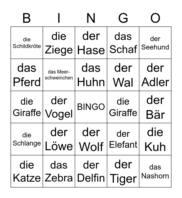 This bingo card has a free space and 29 words: die Katze, der Hund, der Vogel, der Fisch, die Schildkröte, der Hase, das Meer-schweinchen, der Löwe, die Giraffe, das Zebra, der Bär, das Nashorn, der Delfin, der Tiger, der Adler, der Schimpanse, der Wolf, die Schlange, der Seehund, die Giraffe, der Elefant, das Krokodil, der Wal, das Pferd, das Schaf, die Ziege, die Kuh, das Huhn and der Hahn.