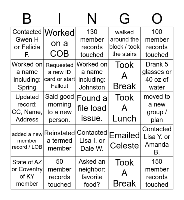 This bingo card has a free space and 24 words: Reinstated a termed member, 50 member records touched, Worked on a name including: Johnston, State of AZ or Coventry of KY member, 100 member records touched, Contacted Gwen H or Felicia F., Worked on a name including: Spring, Worked on a COB, Took A Lunch, Contacted Lisa I. or Dale W., Took A Break, Updated record: CC, Name, Address, Emailed Celeste, Contacted Lisa Y. or Amanda B., Requested a new ID card or start Fallout, Took A Break, moved to a new group / plan, 130 member records touched, Drank 5 glasses or 40 oz of water, Said good morning to a new person., 150 member records touched, added a new member record / LOB, walked around the block / took the stairs and Asked an neighbor: favorite food?.