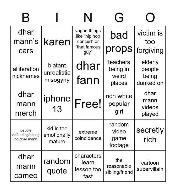 This bingo card has a free space and 29 words: dhar mann cameo, random expensive brand, iphone 13, PS5, dhar mann’s cars, vague things like “hip hop concert” or “that famous guy”, blatant unrealistic misogyny, kid is too emotionally mature, rich white popular girl, random quote, dhar mann videos played, cartoon supervillain, characters learn lesson too fast, the reasonable sibling/friend, elderly people being dunked on, husband looses job, extreme coincidence, people defending/hating on dhar mann, victim is too forgiving, dhar mann merch, random video game footage, inappropriate music, teachers being in weird places, alliteration nicknames, bad props, karen, secretly rich, dhar fann and on the nose names.