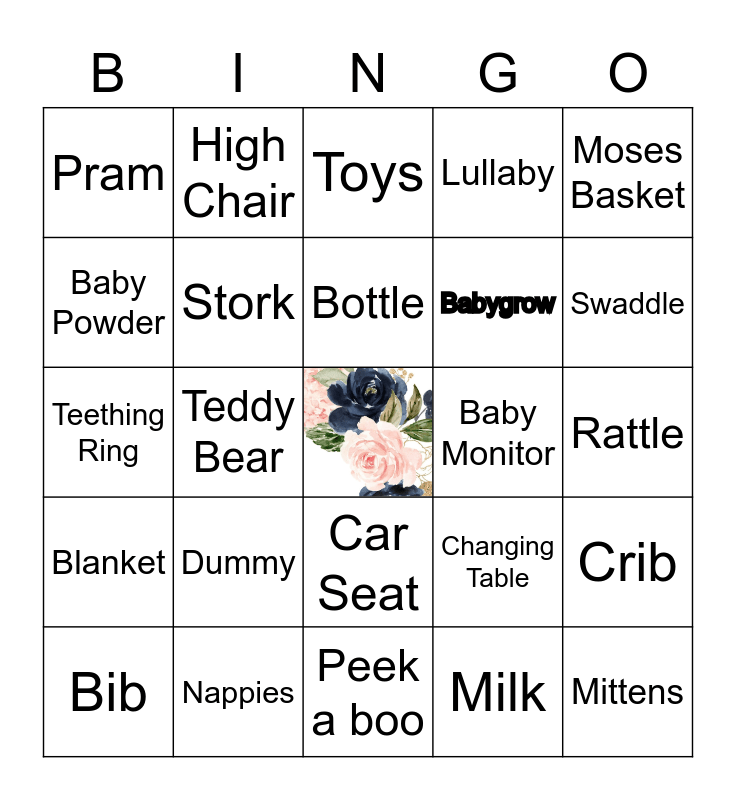 This bingo card has a free space and 24 words: Dummy, Nappies, Bottle, Bib, Moses Basket, Pram, Baby Powder, High Chair, Baby Monitor, Car Seat, Babygrow, Teething Ring, Changing Table, Crib, Stork, Milk, Rattle, Toys, Swaddle, Teddy Bear, Mittens, Blanket, Lullaby and Peek a boo.