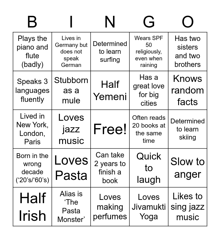 This bingo card has a free space and 24 words: Loves Pasta, Alias is ‘The Pasta Monster’, Half Yemeni, Half Irish, Has two sisters and two brothers, Plays the piano and flute (badly), Speaks 3 languages fluently, Lives in Germany but does not speak German, Often reads 20 books at the same time, Can take 2 years to finish a book, Has a great love for big cities, Lived in New York, London, Paris, Quick to laugh, Slow to anger, Stubborn as a mule, Loves Jivamukti Yoga, Determined to learn skiing, Determined to learn surfing, Knows random facts, Loves jazz music, Likes to sing jazz music, Born in the wrong decade (‘20’s/‘60’s), Wears SPF 50 religiously, even when raining and Loves making perfumes.