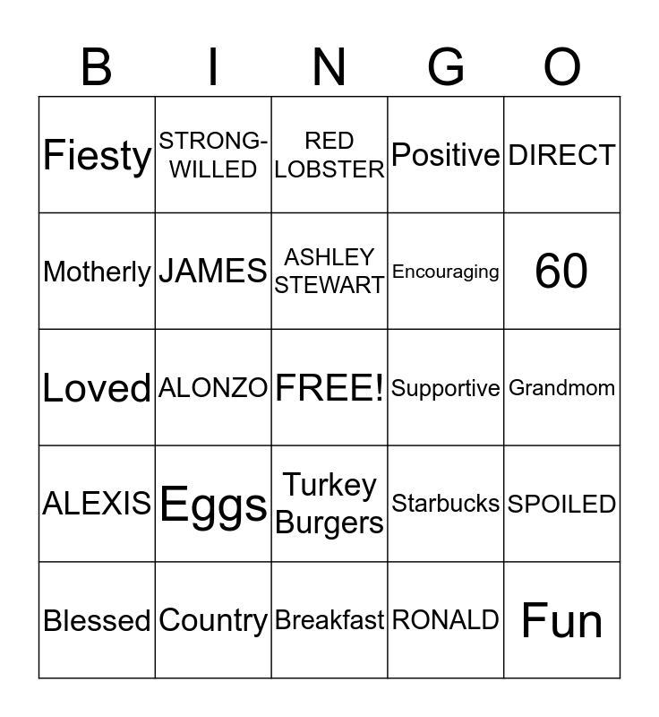 This bingo card has a free space and 32 words: RONALD, NINA, ALONZO, AARON, ALEXIS, JAMES, DIRECT, SPOILED, STRONG-WILLED, MACY'S, ASHLEY STEWART, RED LOBSTER, GREAT MOM, Nurturing, Supportive, Church Going, Blessed, Loved, Turkey Burgers, Eggs, Starbucks, Coffee, Grandmom, Country, Fun, Positive, Encouraging, Motherly, Fiesty, Breakfast, Hardworker and 60.
