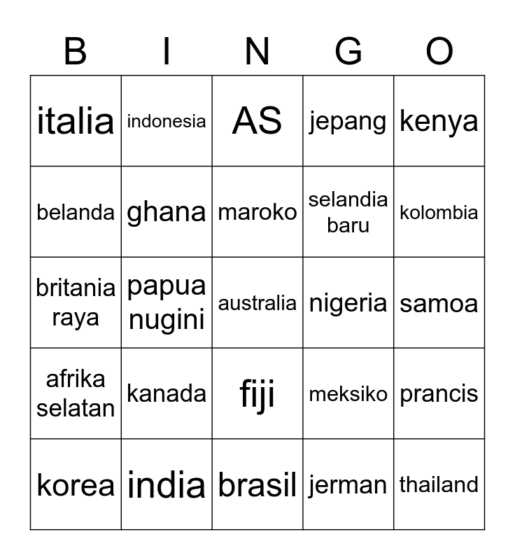This bingo card has a free space and 24 words: korea, kanada, maroko, jerman, kenya, italia, indonesia, AS, nigeria, samoa, britania raya, ghana, meksiko, prancis, belanda, india, brasil, jepang, kolombia, afrika selatan, papua nugini, fiji, selandia baru and thailand.