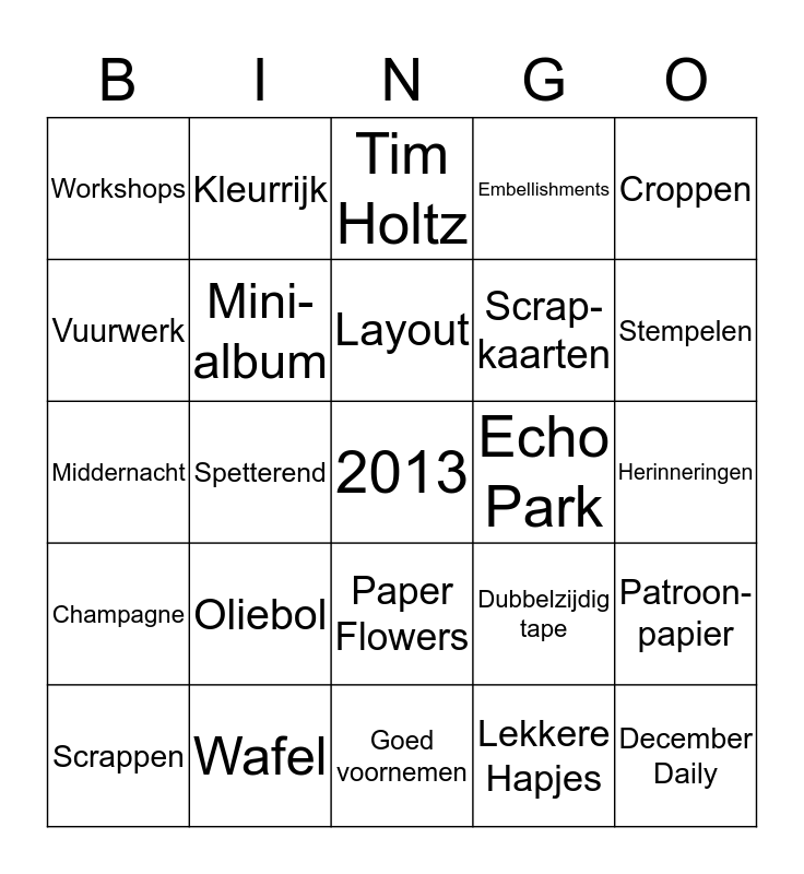 This bingo card has 25 words: Oliebol, Goed voornemen, Layout, Scrappen, Croppen, Workshops, Vuurwerk, Kleurrijk, Echo Park, Paper Flowers, Scrap-kaarten, Middernacht, Dubbelzijdig tape, Patroon- papier, Mini-album, December Daily, Herinneringen, Tim Holtz, Stempelen, Spetterend, 2013, Wafel, Champagne, Embellishments and Lekkere Hapjes.