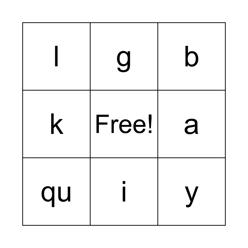 This bingo card has a free space and 8 words: a, b, g, qu, l, y, k and i.