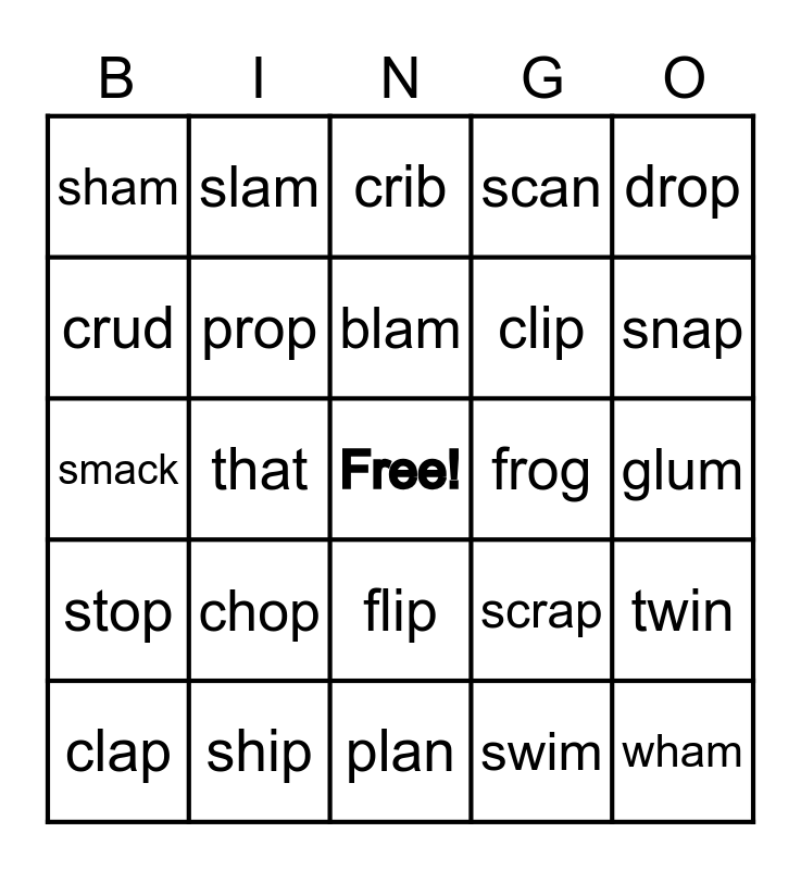 This bingo card has a free space and 24 words: chop, ship, blam, clap, drop, sham, crud, slam, frog, flip, clip, smack, scrap, twin, prop, swim, glum, crib, snap, that, wham, stop, scan and plan.