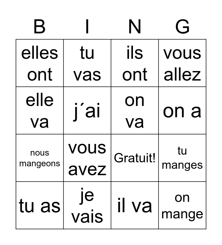 This bingo card has 16 words: je vais, tu manges, ils ont, elles ont, nous mangeons, tu vas, Gratuit!, il va, elle va, j´ai, tu as, vous allez, vous avez, on a, on va and on mange.