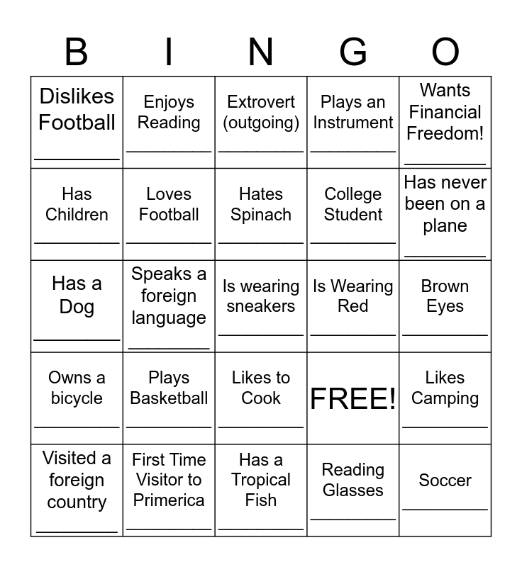 This bingo card has 25 words: Plays Basketball _________, Has a Tropical Fish _________, Hates Spinach _________, Visited a foreign country ________, Wants Financial Freedom! ________, Dislikes Football _______, Has Children _________, Enjoys Reading _________, Is Wearing Red _________, Likes to Cook _________, College Student _________, Has a Dog ________, FREE!, Likes Camping _________, Loves Football _________, Soccer _________, Brown Eyes _________, Extrovert (outgoing) _________, Has never been on a plane ________, Speaks a foreign language ________, Is wearing sneakers _________, First Time Visitor to Primerica _________, Owns a bicycle _________, Plays an Instrument _________ and Reading Glasses _________.