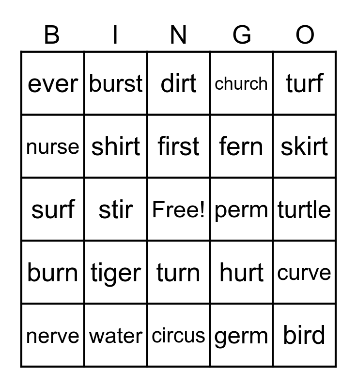 This bingo card has a free space and 35 words: swirl, girl, burn, shirt, turn, church, nurse, purse, first, third, surf, turf, curb, her, ever, perm, germ, stir, burn, bird, hurt, nerve, curve, water, dirt, skirt, flirt, blurt, fern, turtle, dinner, circus, tiger, burst and herd.