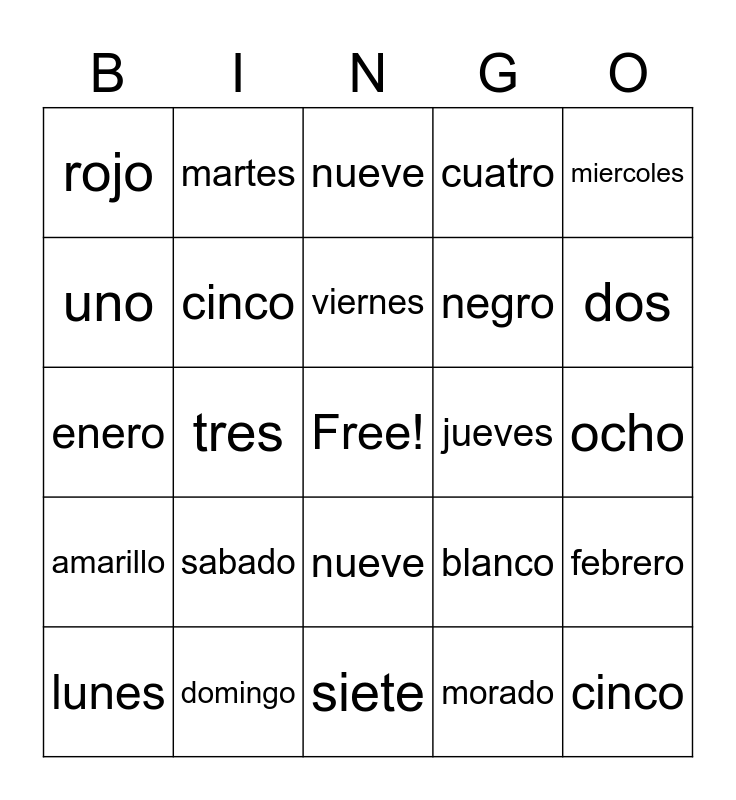 This bingo card has a free space and 24 words: sabado, domingo, viernes, lunes, miercoles, rojo, uno, martes, jueves, nueve, negro, enero, blanco, febrero, cinco, morado, ocho, nueve, dos, tres, cinco, amarillo, cuatro and siete.