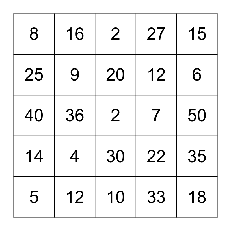 This bingo card has 25 words: 4, 10, 20, 5, 15, 8, 25, 16, 7, 30, 12, 40, 22, 35, 9, 18, 50, 2, 6, 36, 2, 12, 14, 27 and 33.