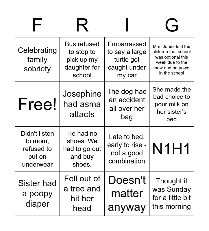 This bingo card has 16 words: Fell out of a tree and hit her head, N1H1, Embarrassed to say a large turtle got caught under my car, Celebrating family sobriety, Didn't listen to mom, refused to put on underwear, Bus refused to stop to pick up my daughter for school, Late to bed, early to rise - not a good combination, Doesn't matter anyway, Free!, Josephine had asma attacts, Sister had a poopy diaper, Mrs. Jones told the children that school was optional this week due to the snow and no power in the school, He had no shoes. We had to go out and buy shoes., She made the bad choice to pour milk on her sister's bed, The dog had an accident all over her bag and Thought it was Sunday for a little bit this morning.