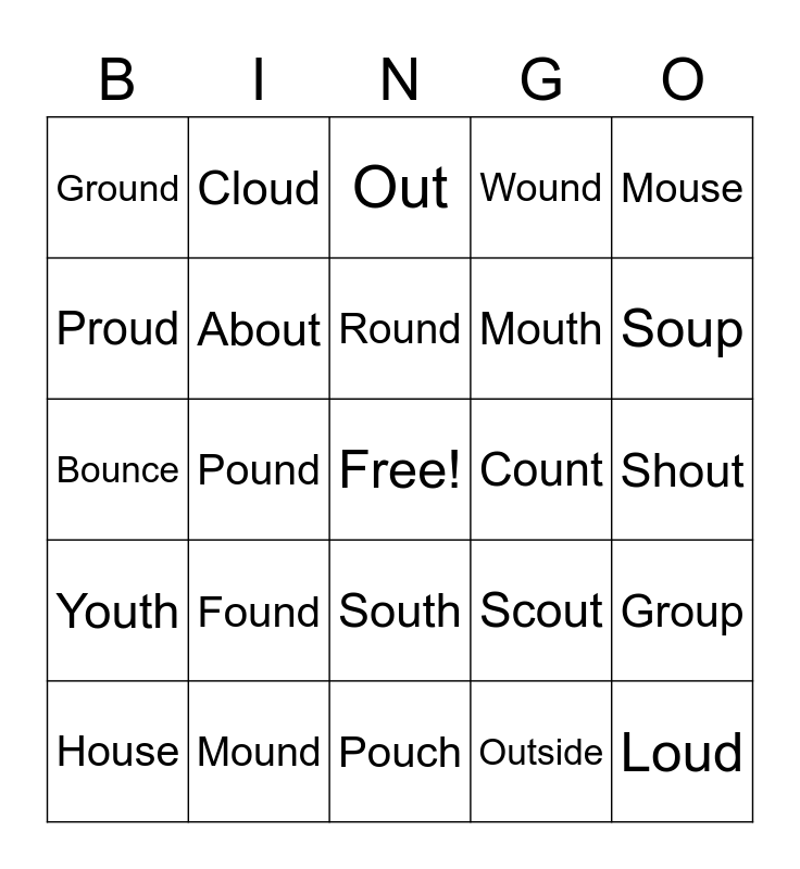 This bingo card has a free space and 24 words: Found, Mound, Round, House, Mouse, Ground, Proud, Cloud, Count, South, Mouth, Bounce, Scout, Group, About, Outside, Shout, Out, Soup, Pound, Loud, Youth, Wound and Pouch.