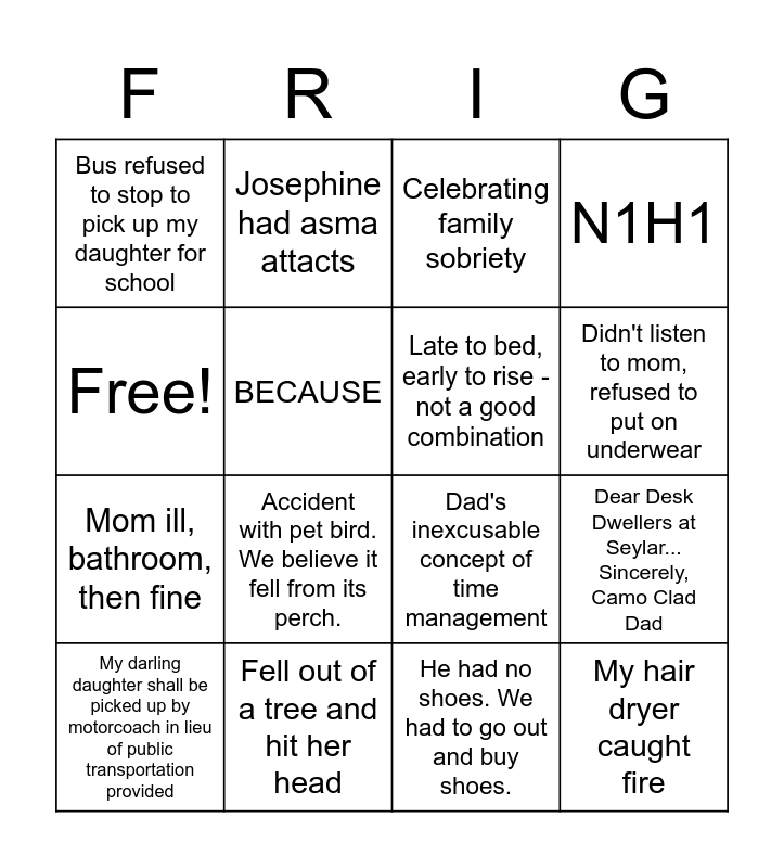 This bingo card has 16 words: Fell out of a tree and hit her head, Dear Desk Dwellers at Seylar... Sincerely, Camo Clad Dad, Celebrating family sobriety, Bus refused to stop to pick up my daughter for school, Mom ill, bathroom, then fine, Josephine had asma attacts, Dad's inexcusable concept of time management, He had no shoes. We had to go out and buy shoes., Free!, BECAUSE, My darling daughter shall be picked up by motorcoach in lieu of public transportation provided, N1H1, Accident with pet bird. We believe it fell from its perch., Didn't listen to mom, refused to put on underwear, Late to bed, early to rise - not a good combination and My hair dryer caught fire.