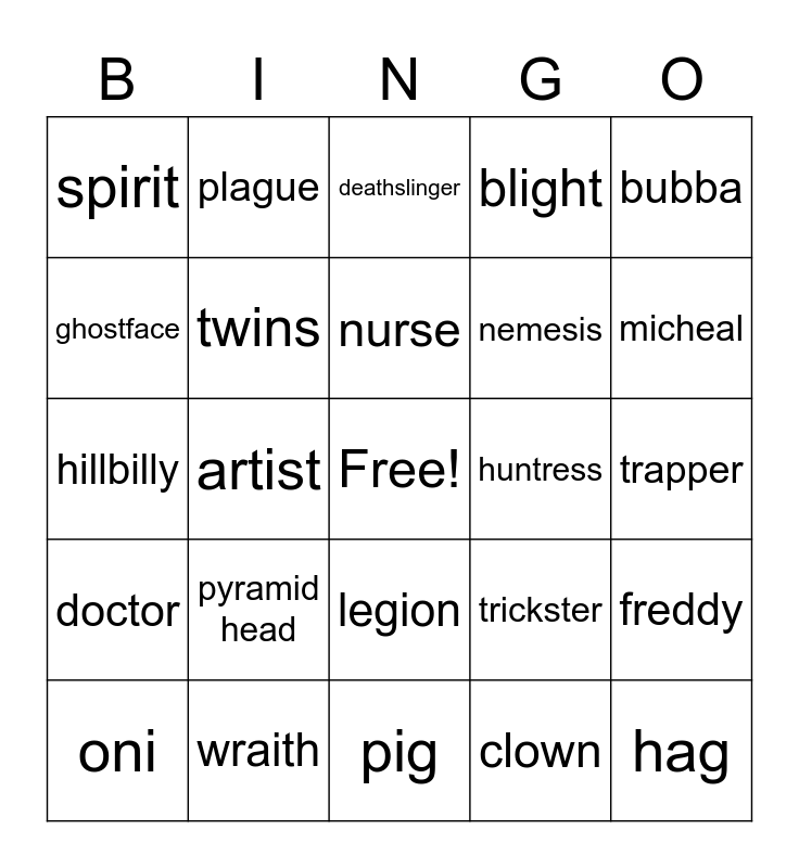 This bingo card has a free space and 26 words: legion, clown, nurse, wraith, bubba, spirit, ghostface, plague, trapper, trickster, nemesis, hillbilly, freddy, oni, artist, pinhead, blight, doctor, deathslinger, hag, micheal, pig, huntress, pyramid head, twins and demogorgon.
