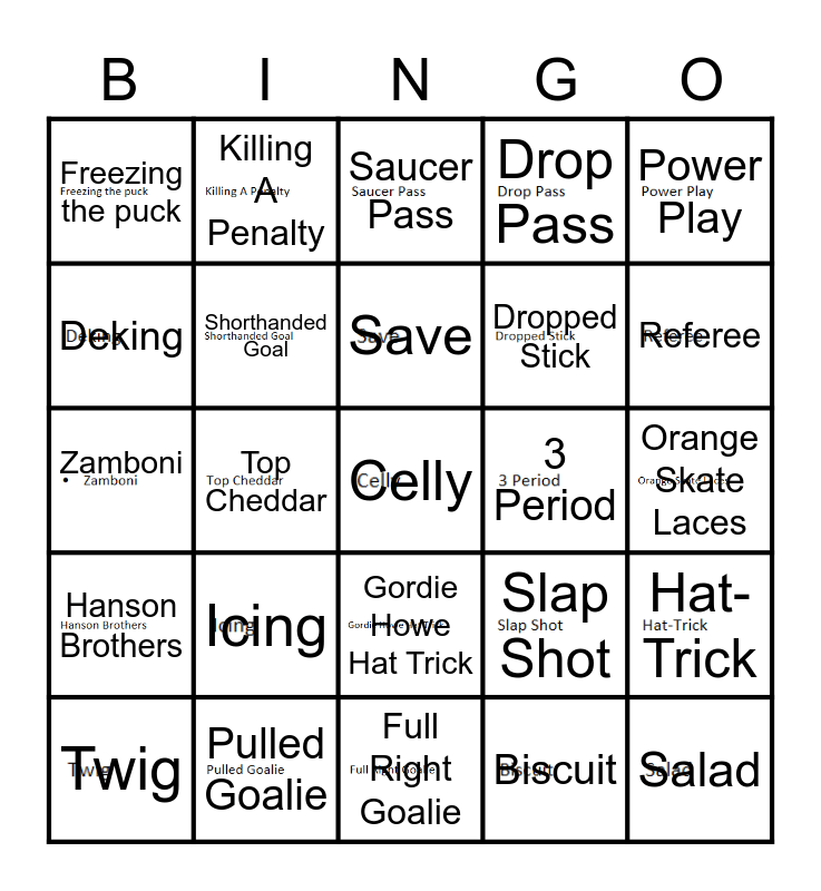 This bingo card has 25 images and 25 words: Icing, Full Right Goalie, Save, Twig, Power Play, Freezing the puck, Deking, Killing A Penalty, 3 Period, Gordie Howe Hat Trick, Dropped Stick, Zamboni, Slap Shot, Hat-Trick, Shorthanded Goal, Salad, Orange Skate Laces, Saucer Pass, Referee, Top Cheddar, Celly, Pulled Goalie, Hanson Brothers, Drop Pass and Biscuit.