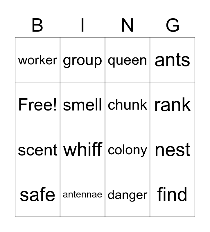 This bingo card has 16 words: antennae, nest, queen, worker, scent, group, colony, danger, Free!, smell, safe, ants, whiff, rank, chunk and find.