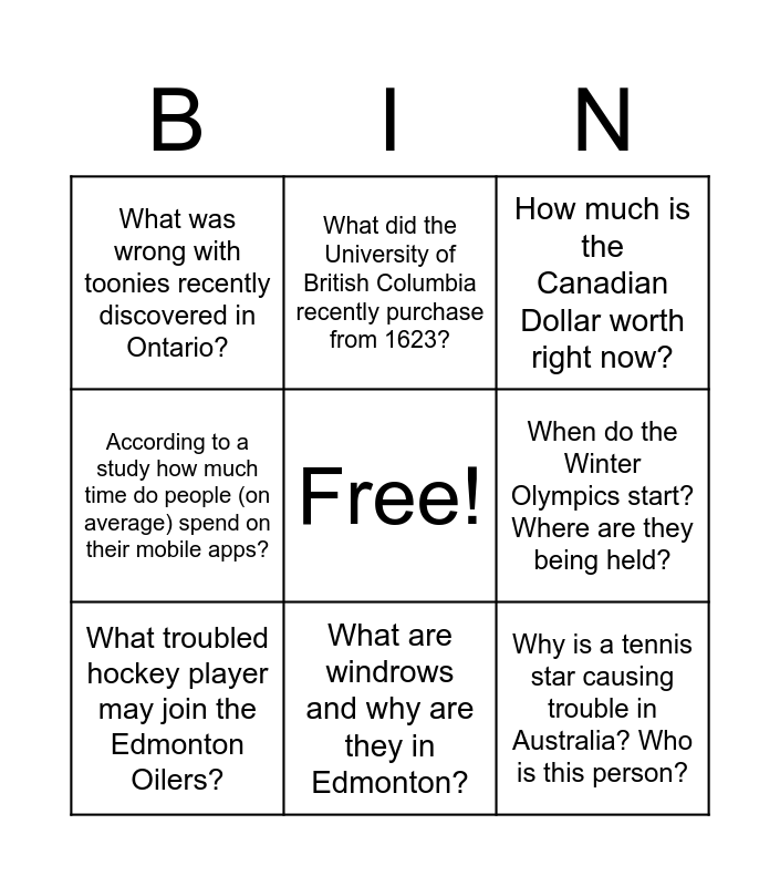 This bingo card has a free space and 8 words: When do the Winter Olympics start? Where are they being held?, How much is the Canadian Dollar worth right now?, What did the University of British Columbia recently purchase from 1623?, What troubled hockey player may join the Edmonton Oilers?, What was wrong with toonies recently discovered in Ontario?, Why is a tennis star causing trouble in Australia? Who is this person?, According to a study how much time do people (on average) spend on their mobile apps? and What are windrows and why are they in Edmonton?.