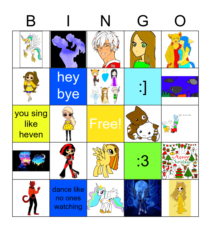 This bingo card has 27 images, a free space and 10 words: hey bye, hi, you are sweet, have a good day, dance like no ones watching, you sing like heven, WINNER DOGS, :3, :] and :).