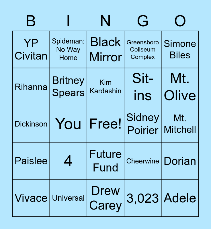 This bingo card has a free space and 75 words: Mr. Corman, Hulu, Black Mirror, Fresh Prince of Bel-Air, Paramount+, Amazon Prime, 1997, Bernie Sanders, All Too Well, Cat, Ellen, He’s All That, Kim Kardashin, Rihanna, The Weeknd, You, Zendaya, Adele, Bridgerton, Simone Biles, The Great Resignation, Dickinson, Britney Spears, Spideman: No Way Home, Greensboro Coliseum Complex, Dogwood, Asheboro, Raleigh, 100, 380, Mt. Airy, GSO, Pepsi, Cheerwine, Mt. Olive, Sit-ins, Biscuitville, 7, Mt. Mitchell, 3,023, Pinehurst, Charlotte, Winston-Salem, JayCees, Junior League, GMA Young Risers, Vivace, YP Civitan, United Way Young Leaders, Campus Greensboro, SynerG, Future Fund, Sunday, MySpace, TikTok, The Krusty Krab, Burbn, Beijing, Great Dane, 2011, 4, 75, Bob Saget, False, True, Sidney Poirier, Disney World, Myrtle Beach, Leroy, Dorian, Paislee, Universal, Scream, Drew Carey and Minecraft.