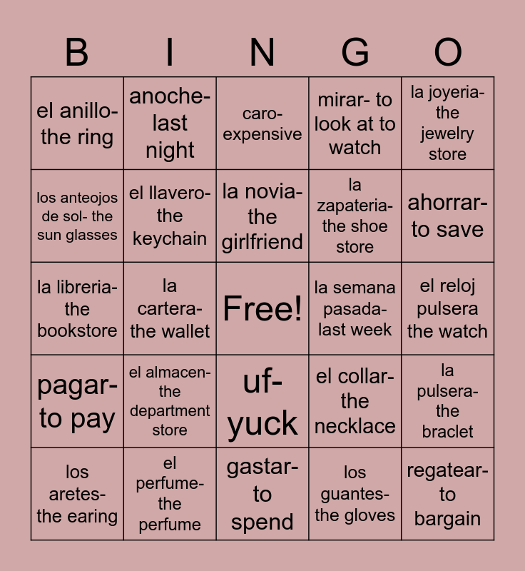 This bingo card has a free space and 24 words: el almacen-the department store, el perfume-the perfume, la novia-the girlfriend, los aretes-the earing, la joyeria- the jewelry store, el anillo- the ring, los anteojos de sol- the sun glasses, anoche-last night, la semana pasada-last week, uf-yuck, la zapateria-the shoe store, la libreria-the bookstore, el collar-the necklace, la pulsera-the braclet, el llavero-the keychain, los guantes- the gloves, el reloj pulsera the watch, caro- expensive, ahorrar- to save, la cartera- the wallet, regatear- to bargain, pagar- to pay, mirar- to look at to watch and gastar- to spend.