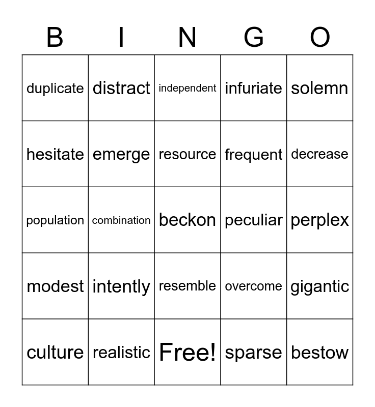 This bingo card has 31 words: Free!, accomplish, combination, crucial, duplicate, independent, emerge, overcome, peculiar, sparse, perplex, beckon, bestow, challenge, decrease, essential, gigantic, intently, modest, resemble, solemn, accurate, culture, distract, frequent, hesitate, infuriate, population, realistic, resource and thrive.
