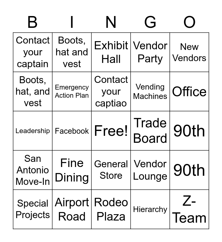 This bingo card has a free space and 66 words: George, General Store, Parking Passes, 90th, New Vendors, No Drinking during your shift, Boots, hat and vest, Facebook, Contact your captiao, George, General Store, Parking Passes, 90th, New Vendors, No Drinking during your shift, Boots, hat, and vest, Facebook, Contact your captain, Shiftboard, Vending Machines, Fine Dining, San Antonio Move-In, Vendor Party, Welcome Wagon, Auctions, Foodies, Voting, Marshmello, Z-Team, Marking, Special Projects, Restocking, Wine Garden, Gold Badge, Vendor Lounge, Airport Road, Rookies, Leadership, Hierarchy, Non Profit, Emergency Action Plan, Handbook, Trade Board, Howdy Bucks, Aaron, Booth, Office, NRG Arena, Corndogs, Newsletters, Golf Cart Certification, Dues, Corral Club, Conflict Waiver, Officer in Charge Robert Clay, Amanda, Julie, NRG Center, Exhibit Hall, Rodeo Plaza, Exhibitors, Teams, Vice-Chairman, Chairman, Coordinators and Rookie Training.