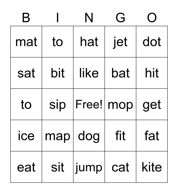 This bingo card has a free space and 24 words: map, sit, like, eat, dot, mat, sat, to, mop, dog, bat, to, fit, fat, bit, cat, get, hat, hit, sip, kite, ice, jet and jump.