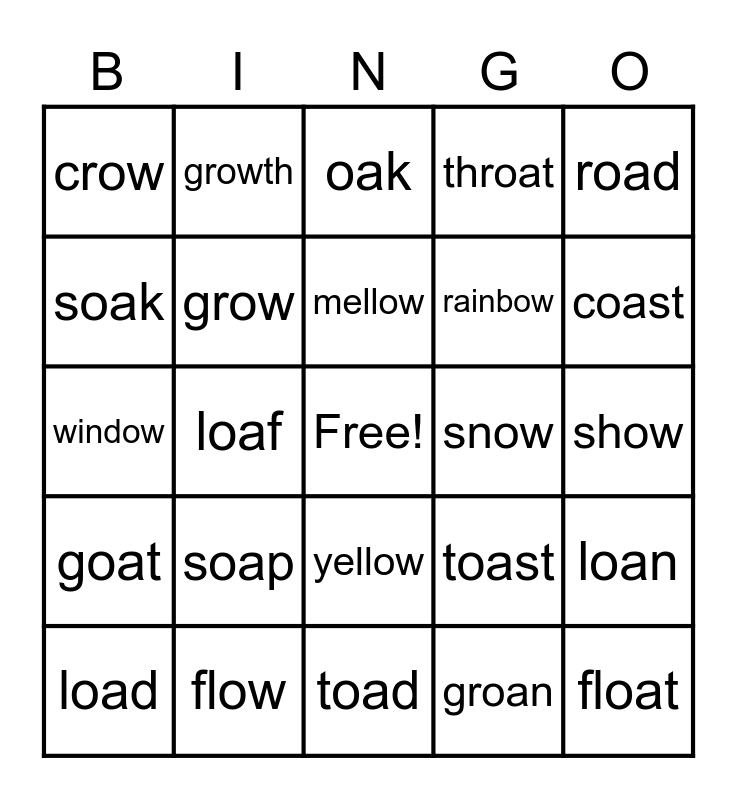 This bingo card has a free space and 29 words: load, boat, loaf, coal, crow, oak, grow, soap, snow, flow, show, float, toad, groan, coast, slow, yellow, goat, road, window, toast, coat, rainbow, soak, throat, growth, loan, mellow and fellow.