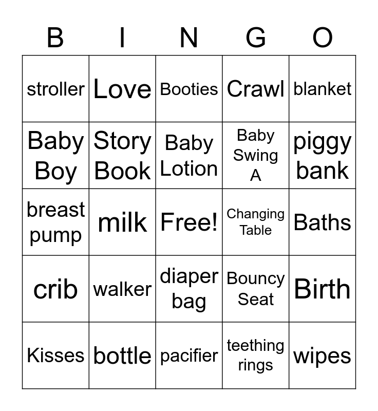 This bingo card has a free space and 60 words: Baby Girl, bottle, nursery, crib, teething rings, teddy bear, Story Book, Hooded Towel, Baby Swing A, Baby Oil, Crawl, Bedtime Stories, Baby Boy, late night, cuddles, stroller, wipes, blanket, Naps, Baby Lotion, Changing Table, Booties, Kisses, Birth, Mom, diaper rash, car seat, toys, piggy bank, rattle, Crying, Stuffed Animals, Thermometer, Sippy Cup, Love, Joy, Daddy, milk, bottle warmer, breast pump, Onesie, walker, Baths, Stroller, Bouncy Seat, Baby Food, Toddler, Formula, Diapers, diaper bag, pacifier, bib, bassinet, humidifier, Baby Powder, High Chair, Bottle Brush, Safety Gate, Newborn and Sleep.