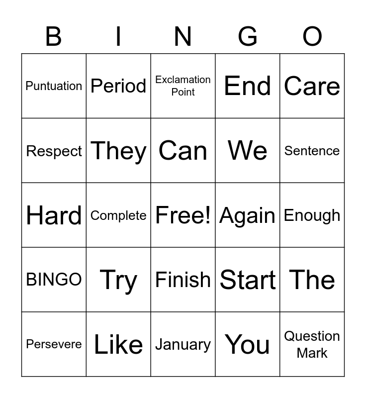 This bingo card has a free space and 24 words: Try, Like, Can, Persevere, Care, Puntuation, Respect, Period, Again, Finish, We, Hard, Start, The, They, You, Enough, Exclamation Point, Sentence, Complete, Question Mark, BINGO, End and January.