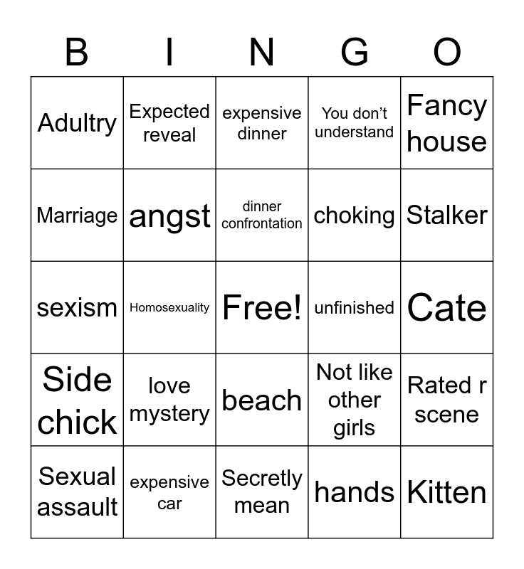 This bingo card has a free space and 40 words: abuse, sexism, blonde, angst, expensive car, beach, dinner confrontation, love triangle, Fancy house, Side chick, Homosexuality, You don’t understand, Kitten, Cate, unfinished, love mystery, Murder, Adultry, suit, expensive dinner, Rated r scene, hands, choking, Marriage, Secret child, Pet references, Nude scene, Age difference, Abusive Date night, Bad comebacks, Cartoon supervillain, Sexual assault, Childhood bsf, Not like other girls, Stalker, Secretly mean, Secretly kind, Mc trips, Expected reveal and Stuttering.