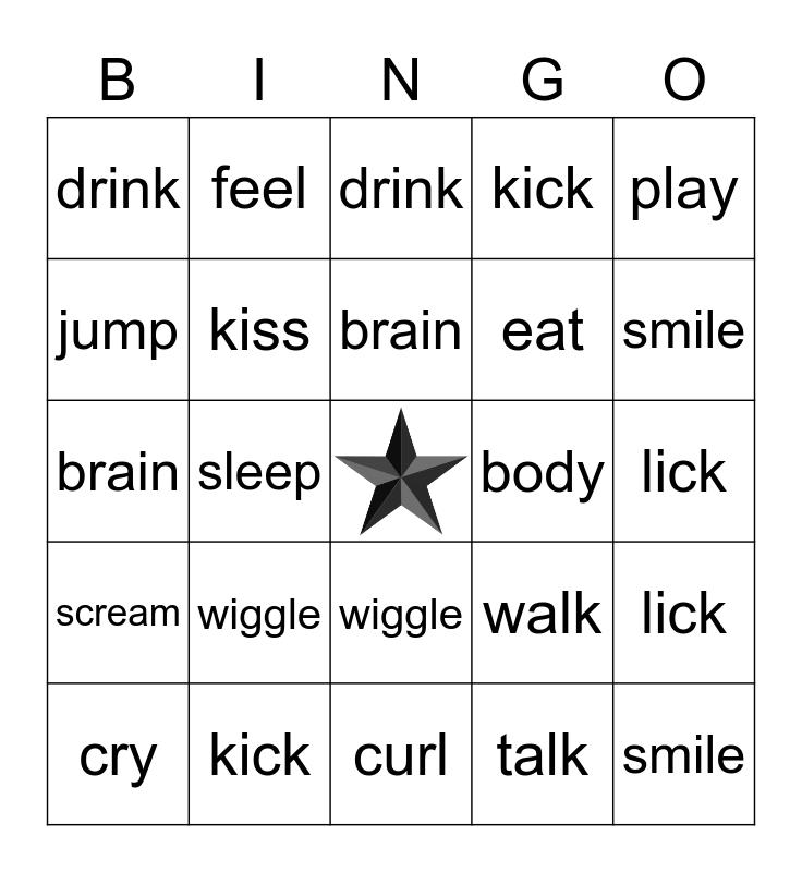 ⚠ This card has duplicate items: frown (2), smile (2), cry (2), curl (2), wiggle (2), scream (2), feel (2), run (2), jump (2), think (2), kiss (2), kick (2), lick (2), walk (2), dance (2), sit (2), brain (2), body (2), stand (2), talk (2), drink (2), eat (2)