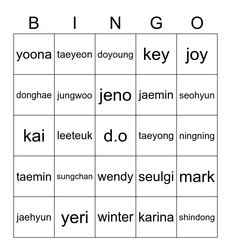 This bingo card has a free space and 24 words: sungchan, yeri, jeno, jaehyun, joy, yoona, donghae, taeyeon, taeyong, wendy, jaemin, kai, seulgi, mark, jungwoo, karina, ningning, doyoung, seohyun, leeteuk, shindong, taemin, key and winter.