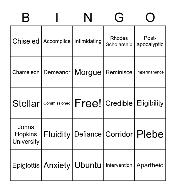 This bingo card has a free space and 24 words: Fluidity, Anxiety, Morgue, Epiglottis, Post-apocalyptic, Chiseled, Chameleon, Accomplice, Credible, Defiance, Reminisce, Stellar, Corridor, Plebe, Demeanor, Intervention, Eligibility, Intimidating, Impermanence, Commissioned, Apartheid, Johns Hopkins University, Rhodes Scholarship and Ubuntu.