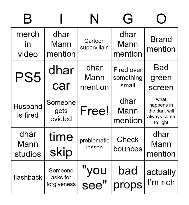 This bingo card has a free space and 29 words: flashback, card gets declined, Someone gets evicted, Don’t judge a book by its cover, merch in video, Cartoon supervillain, dhar car, time skip, dhar Mann mention, Someone asks for forgiveness, what happens in the dark will always come to light, actually I’m rich, "you see", bad props, Bad green screen, dhar Mann quotes himself, problematic lesson, dhar Mann studios, Brand mention, Husband is fired, Check bounces, Allison Day, Fired over something small, PS5, dhar Mann mention, dhar Mann mention, dhar Mann mention, dhar Mann mention and dhar Mann mention.