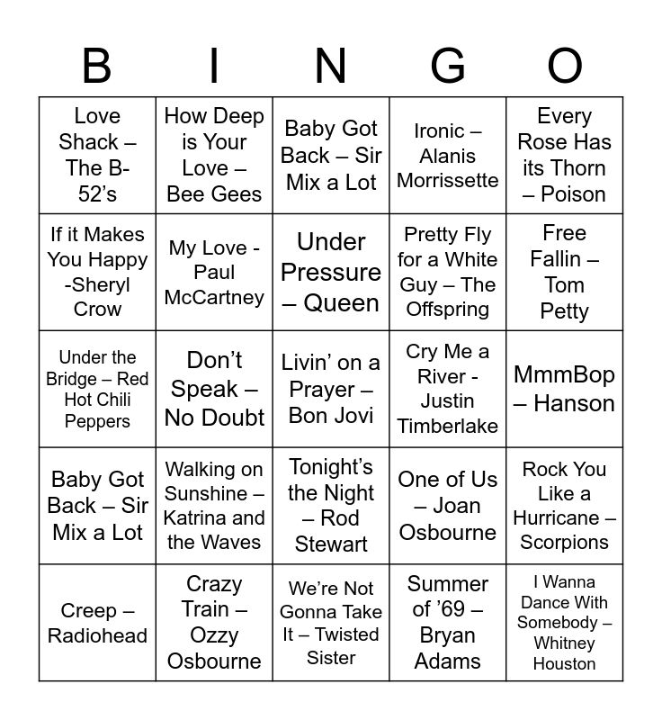 This bingo card has 35 words: American Pie – Don McLean, Wannabe – Spice Girls, What You Waiting For – Gwen Stefani, Pretty Fly for a White Guy – The Offspring, I Wanna Dance With Somebody – Whitney Houston, Love Shack – The B-52’s, My Love -Paul McCartney, Girls Just Want to Have Fun – Cyndi Lauper, Cry Me a River -Justin Timberlake, What’s Up – 4 Non Blondes, Under the Bridge – Red Hot Chili Peppers, How Deep is Your Love – Bee Gees, Tonight’s the Night – Rod Stewart, Pour Some Sugar On Me - Def Leppard, Every Rose Has its Thorn – Poison, Baby Got Back – Sir Mix a Lot, Crazy Train – Ozzy Osbourne, Baby Got Back – Sir Mix a Lot, Summer of ’69 – Bryan Adams, MmmBop – Hanson, Creep – Radiohead, Don’t Speak – No Doubt, Livin’ on a Prayer – Bon Jovi, Sweet Child o Mine – Guns n Roses, Free Fallin – Tom Petty, If it Makes You Happy -Sheryl Crow, Back in Black – AC/DC, We’re Not Gonna Take It – Twisted Sister, One of Us – Joan Osbourne, Rock You Like a Hurricane – Scorpions, Material Girl – Madonna, Walking on Sunshine – Katrina and the Waves, Under Pressure – Queen, Ironic – Alanis Morrissette and Mr. Jones – Counting Crows.