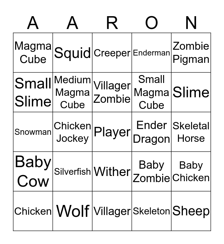 This bingo card has a free space and 44 words: Cow, Sheep, Pig, Chicken, Zombie, Skeleton, Creeper, Blaze, Zombie Pigman, Wolf, Enderman, Ender Dragon, Wither, Silverfish, Mooshroom, Villager, Iron Golem, Snowman, Spider, Slime, Squid, Ghast, Witch, Magma Cube, Wither Skeleton, Skeletal Horse, Horse, Baby Wolf, Baby Zombie, Baby Cow, Baby Sheep, Baby Chicken, Baby Pig, Spider Jockey, Chicken Jockey, Baby Zombie Pigman, Baby Mooshroom, Baby Villager, Villager Zombie, Small Slime, Small Magma Cube, Medium Slime, Medium Magma Cube and Cave Spider.