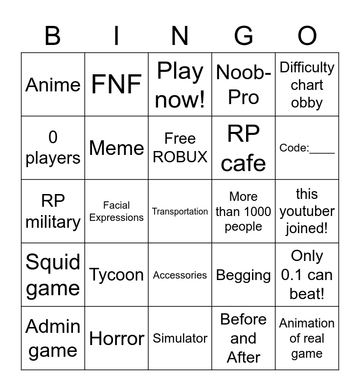 This bingo card has 25 words: Tycoon, Simulator, Free ROBUX, Admin game, Difficulty chart obby, Anime, 0 players, FNF, More than 1000 people, Accessories, RP cafe, RP military, Begging, Only 0.1 can beat!, Meme, Animation of real game, this youtuber joined!, Play now!, Code:____, Facial Expressions, Transportation, Horror, Squid game, Noob-Pro and Before and After.