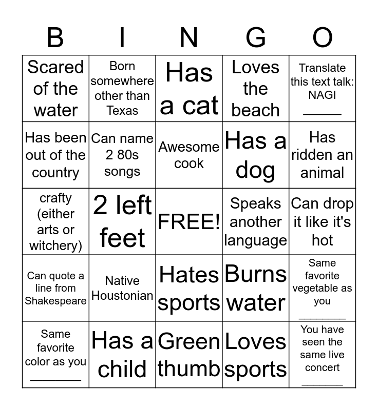 This bingo card has a free space and 24 words: Native Houstonian, Has a child, Awesome cook, Same favorite color as you ________, Translate this text talk: NAGI ______, Scared of the water, Has been out of the country, Born somewhere other than Texas, Speaks another language, Hates sports, Has a dog, crafty (either arts or witchery), Burns water, Same favorite vegetable as you ________, Can name 2 80s songs, Loves sports, Can drop it like it's hot, Has a cat, Has ridden an animal, 2 left feet, You have seen the same live concert _______, Can quote a line from Shakespeare, Loves the beach and Green thumb.